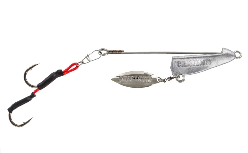 The Chasebaits Squid Rig is a rigging system for the Chasebaits The Ultimate Squid. Available in a range of sizes to match the different sizes of The Ultimate Squid, all include the molded weight jig head, strong and sharp 4/0 twin assist hooks, and a custom Willow blade. Designed to sink at the perfect angle for impeccable hood wing movement and balanced action. The twin assist hooks are attached to the rig with a quick-release clip rated to 85 pounds, and the included flash blade can be replaced with a treble, stinger hook, or any other required accessory.