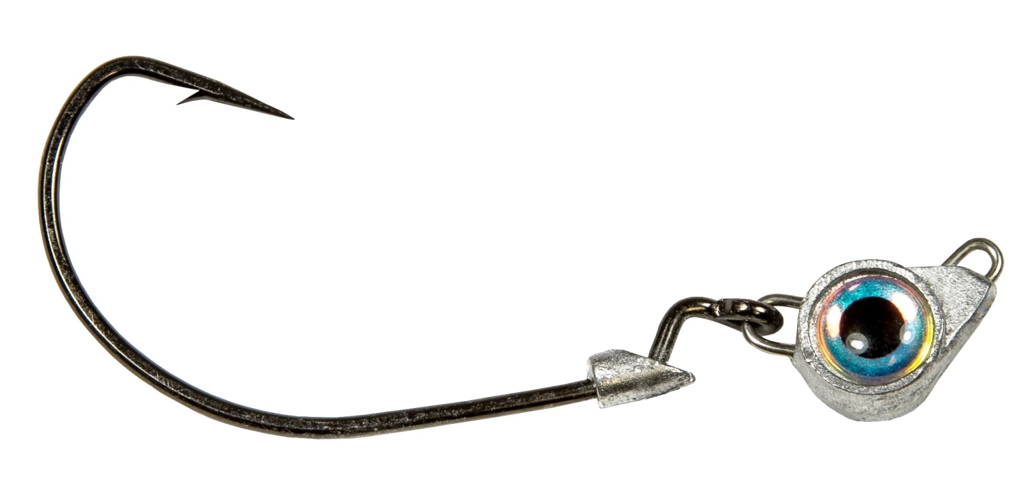 The Z-Man Texas Eye Jigheads are articulated jig heads. Melding a weedless Texas rig with a free-pivoting jighead and the prominent strike target of oversized 3D eyes, the Texas Eye Jighead gives anglers an unbeatable one-two punch. Designed to easily shed grass and prevent fouling or snagging on wood, rock, or shell, the flat sided head and upturned line tie eyelet creates a stable jighead with a spoon-like swimming quality when paired with either paddle-tail swimbaits or straight-tail baits.